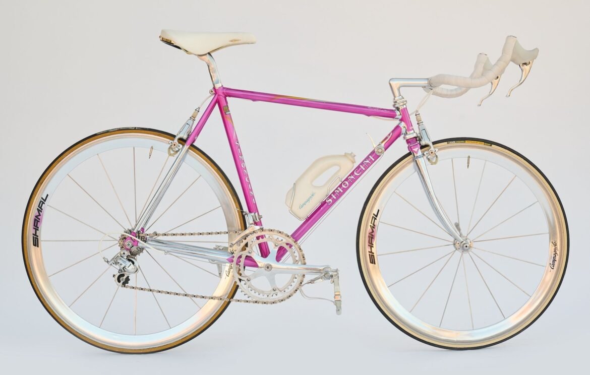 The build remains an all-Italian affair. Aside from the Vittoria Competition tyres and Selle San Marco Rolls saddle, complete with a white leather cover, Campagnolo reigns supreme. The Record groupset features the iconic Delta brake calipers and includes the pedals, too. The Shamal wheels, 650c at the front and 700c at the rear, use 16 bladed spokes, with eight crossed on the gear side and eight laced radially on the ‘off’ side.