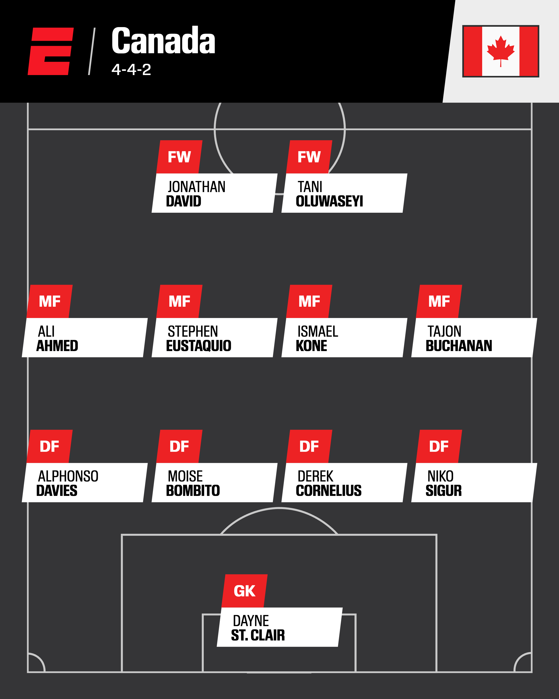 Projected squad: (Goalkeepers) Dayne St. Clair, Maxime Crepeau, Owen Goodman; (Defenders) Alphonso Davies, Moise Bombito, Derek Cornelius, Niko Sigur, Alistair Johnston, Richie Laryea, Zorhan Bassong, Luc de Fougerolles, Joel Waterman, Kamal Miller; (Midfielders) Mathieu Choiniere, Ali Ahmed, Stephen Eustaquio, Ismael Kone, Tajon Buchanan, Nathan Saliba, Marcelo Flores, Jacob Schaffelburg; (Forwards) Liam Millar, Jonathan David, Tani Oluwaseyi, Promise David, Cyle Larin