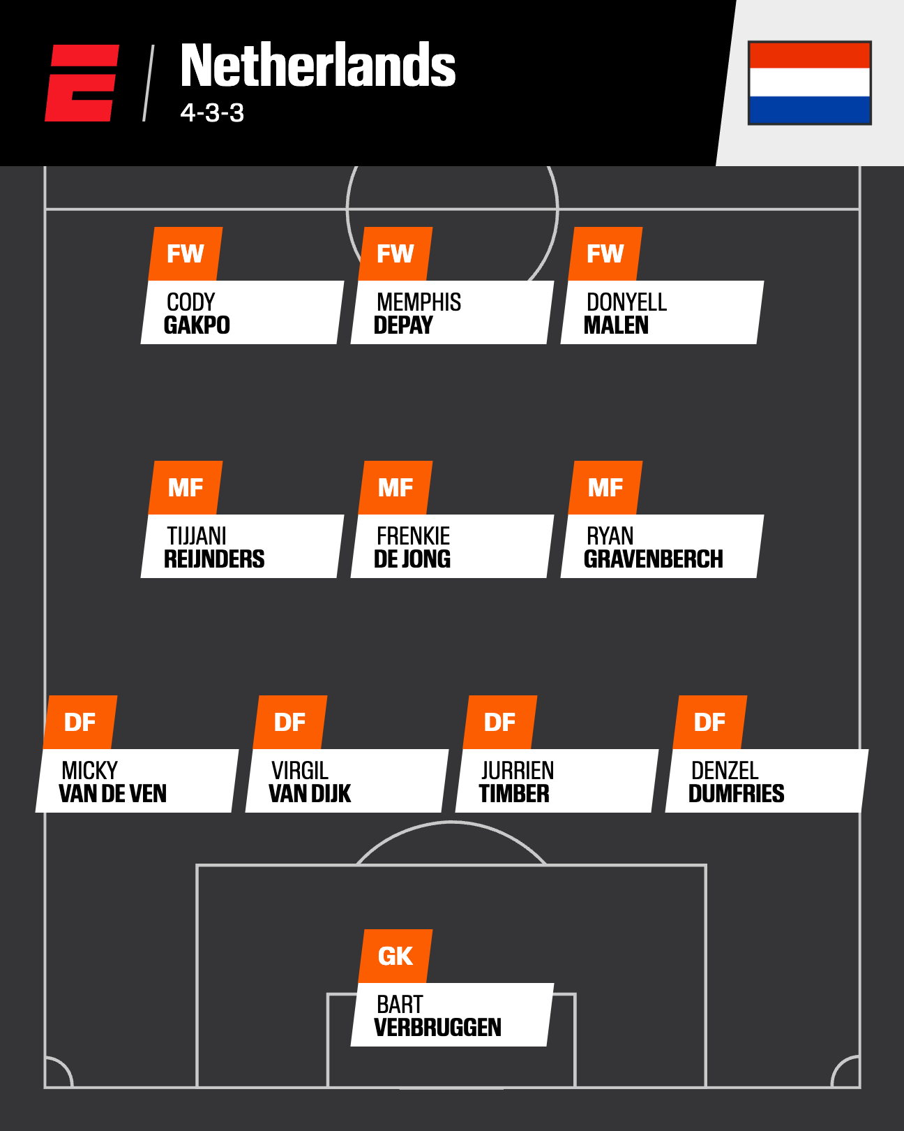 Projected squad: (Goalkeepers) Bart Verbruggen, Robin Roefs, Mark Flekken; (Defenders) Denzel Dumfries, Jurrien Timber, Virgil van Dijk, Micky van de Ven, Nathan Ake, Lutsharel Geertruida, Jeremy Frimpong, Jan Paul van Hecke; (Midfielders) Ryan Gravenberch, Frenkie de Jong, Tijjani Reijnders, Xavi Simons, Jerdy Schouten, Teun Koopmeiners, Luciano Valente, Quinten Timber; (Forwards) Donyell Malen, Memphis Depay, Cody Gakpo, Noa Lang, Emmanuel Emegha, Justin Kluivert, Brian Brobbey