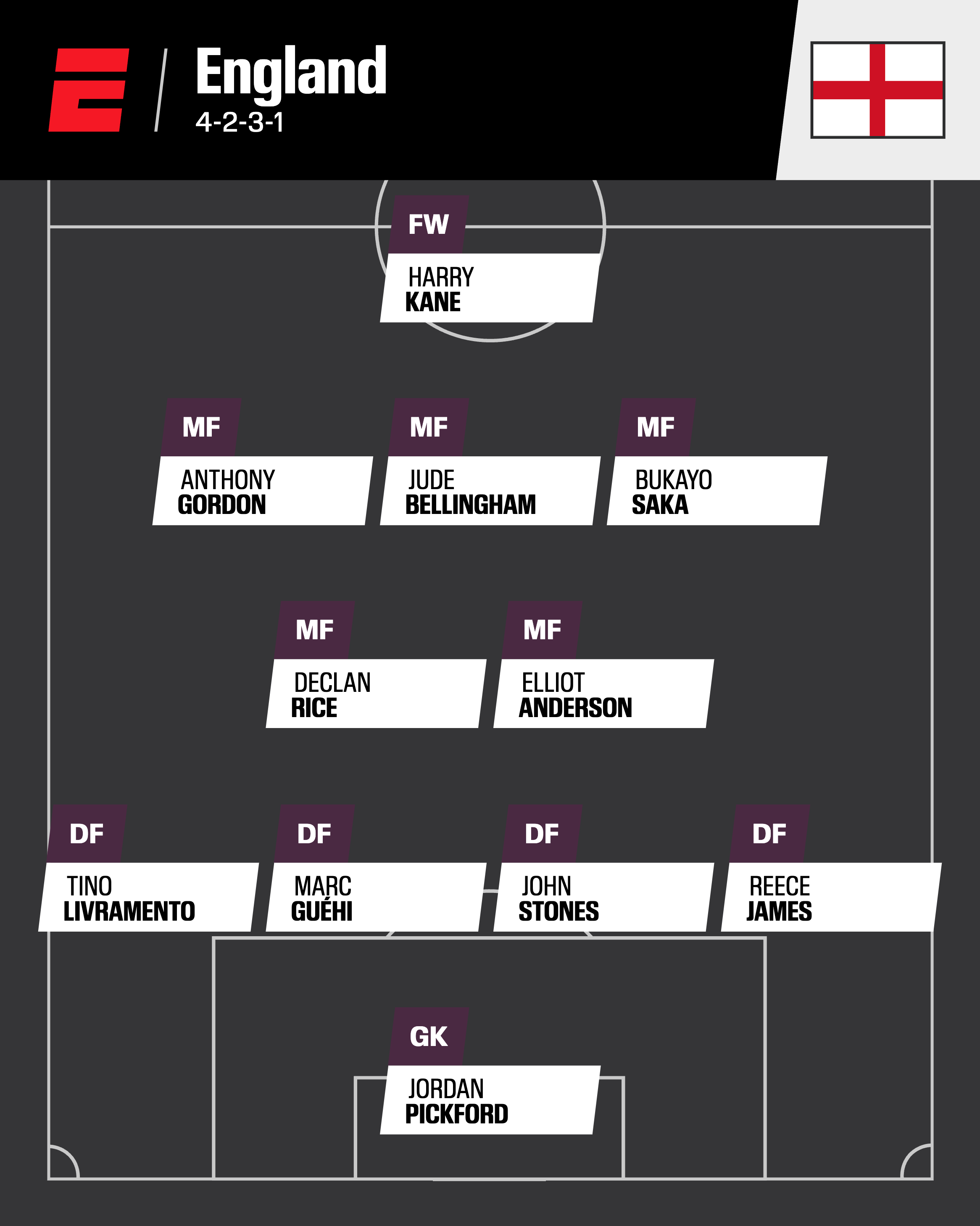 Projected squad: (Goalkeepers) Jordan Pickford, Dean Henderson, Nick Pope; (Defenders) Nico O’Reilly, Ezri Konsa, Dan Burn, Tino Livramento, Marc Guehi, John Stones, Reece James, Trent Alexander-Arnold, Lewis Hall; (Midfielders) Elliot Anderson, Declan Rice, Jude Bellingham, Adam Wharton, Jordan Henderson, Morgan Rogers, Phil Foden, Cole Palmer; (Forwards) Anthony Gordon, Bukayo Saka, Marcus Rashford, Jarrod Bowen, Ollie Watkins, Harry Kane