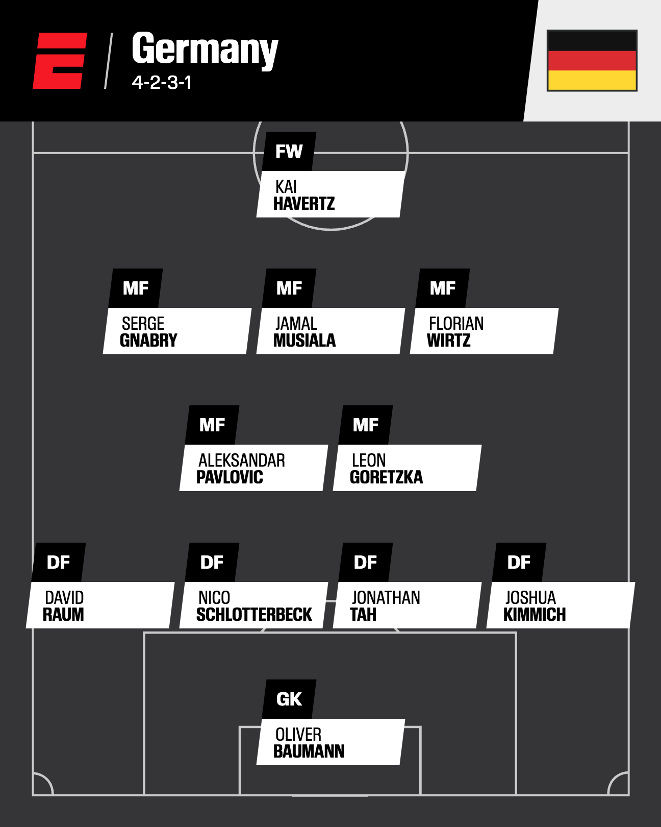 There’s depth in central defense (you can chuck Yann Bisseck and Thilo Kehrer in there too) and in attacking midfield, where the combination of Musiala and Florian Wirtz, on paper, looks as good as any. Yet the center forward position is an enigma. Havertz isn’t a real No. 9 striker and has started two league games over the past 13 months; meanwhile, alternatives such as Deniz Undav, Jonathan Burkardt and Niclas Füllkrug (the latter whom I don’t think will make the cut) are suboptimal. Central midfield is also light, unless Nagelsmann moves Kimmich there and leaves a gaping hole at right back instead. — Gab Marcotti