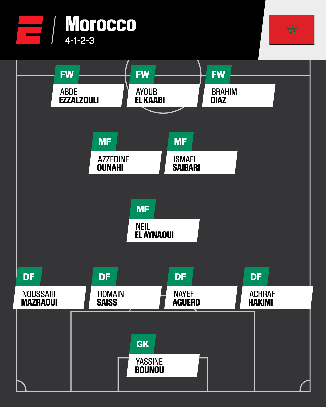 Projected squad: (Goalkeepers) Yassine Bounou, Munir Mohamedi, El Mehdi Al Harrar; (Defenders) Achraf Hakimi, Romain Saiss, Nayef Aguerd, Noussair Mazraoui, Mohamed Chibi, Jawad El Yamiq, Abdelhamid Ait Boudlal, Anass Salah-Eddine, Youssef Belammari, Adam Masina; (Midfielders) Neil El Aynaoui, Azzedine Ounahi, Ismael Saibari, Sofyan Amrabat, Bilal El Khannouss, Oussama Targhalline; (Forwards) Brahim Diaz, Ayoub El Kaabi, Abde Ezzalzouli, Ilias Akhomach, Chemsidine Taibi, Youssef En-Nesryi, Eliesse Ben Seghir