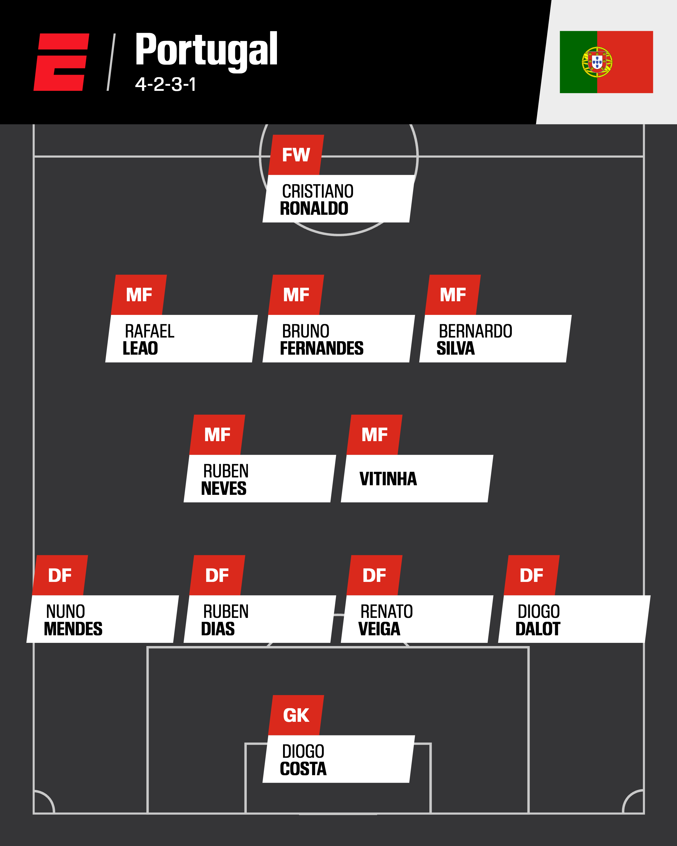 Projected squad: (Goalkeepers) Diogo Costa, Jose Sa, Rui Silva; (Defenders) Diogo Dalot, Renato Veiga, Ruben Dias, Matheus Nunes, Nuno Mendes, Antonio Silva, Goncalo Inacio, Joao Cancelo; (Midfielders) Vitinha, Ruben Neves, Bernardo Silva, Bruno Fernandes, Joao Neves, Joao Palhinha, Pedro Goncalves; (Forwards) Cristiano Ronaldo, Rafael Leao, Francisco Conceicao, Joao Felix, Francisco Trincao, Goncalo Ramos, Carlos Forbs, Pedro Neto