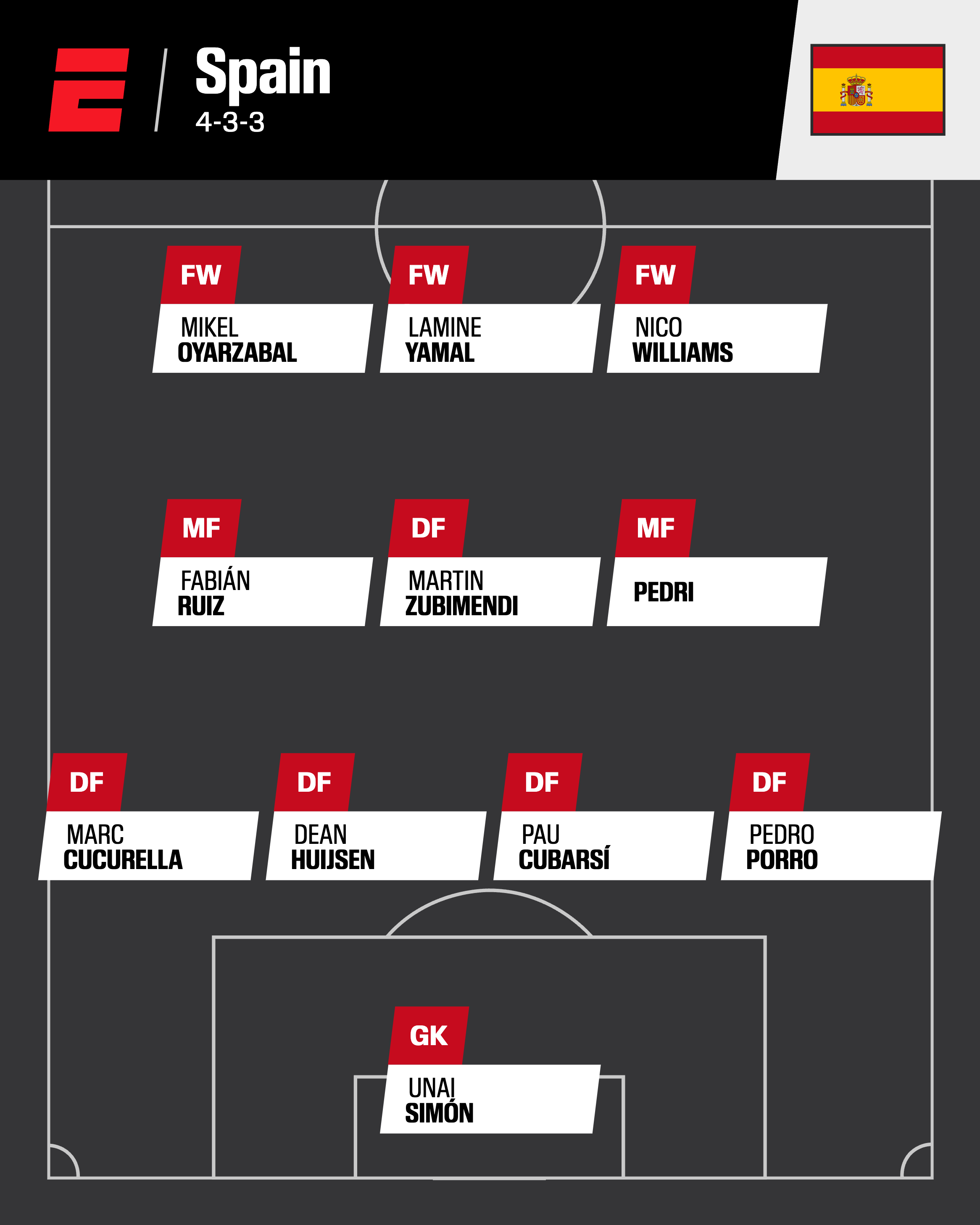 Projected squad: (Goalkeepers) Unai Simón, David Raya, Joan García; (Defenders) Pedro Porro, Dani Carvajal, Marcos Llorente, Dean Huijsen, Pau Cubarsí, Robin Le Normand, Aymeric Laporte, Eric García, Marc Cucurella, Alejandro Grimaldo; (Midfielders) Martín Zubimendi, Rodri, Fabián Ruiz, Pedri, Dani Olmo, Álex Baena, Fermín López, Pablo Barrios; (Forwards) Nico Williams, Lamine Yamal, Mikel Oyarzabal, Ferran Torres, Borja Iglesias