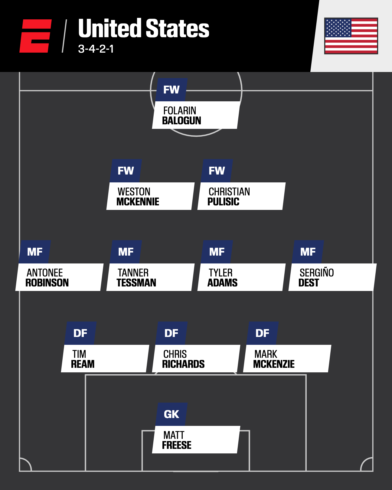 Projected squad: (Goalkeepers) Matt Freese, Matt Turner, Patrick Schulte; (Defenders) Tim Ream, Chris Richards, Mark McKenzie, Miles Robinson, Noahkai Banks, Alex Freeman, Max Arfsten, Antonee Robinson, Sergino Dest; (Midfielders) Tanner Tessman, Tyler Adams, Cristian Roldan, Aidan Morris, Malik Tillman, Alejandro Zendejas, Brendan Aaronson, Diego Luna, Weston McKennie; (Forwards) Christian Pulisic, Folarin Balogun, Ricardo Pepi, Patrick Agyemang, Tim Weah