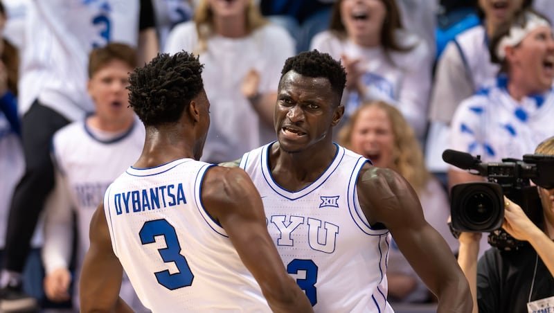 BYU Cougars forward AJ Dybantsa (3) celebrates with BYU Cougars center Keba Keita (13) as they play the Texas Tech Red Raiders at the Marriott Center in Provo, on Saturday, March 7, 2026. BYU won 82-76. | Scott G Winterton, Deseret News