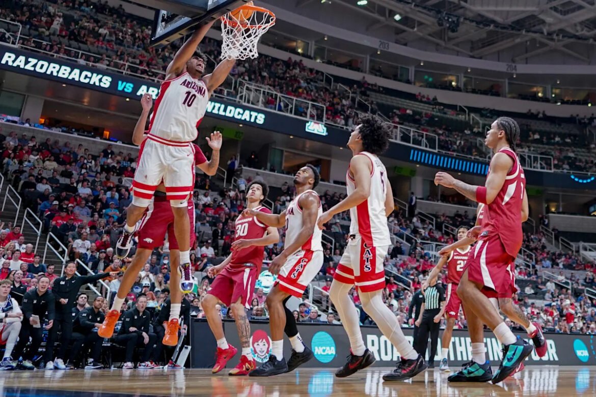 Mar 26, 2026; San Jose, CA, USA; Arizona Wildcats forward Koa Peat (10) dunks the ball against the Arkansas Razorbacks in the second half during a Sweet Sixteen game of the West Regional of the men’s 2026 NCAA Tournament at SAP Center. Mandatory Credit: Kyle Terada-Imagn Images | Kyle Terada-Imagn Images
