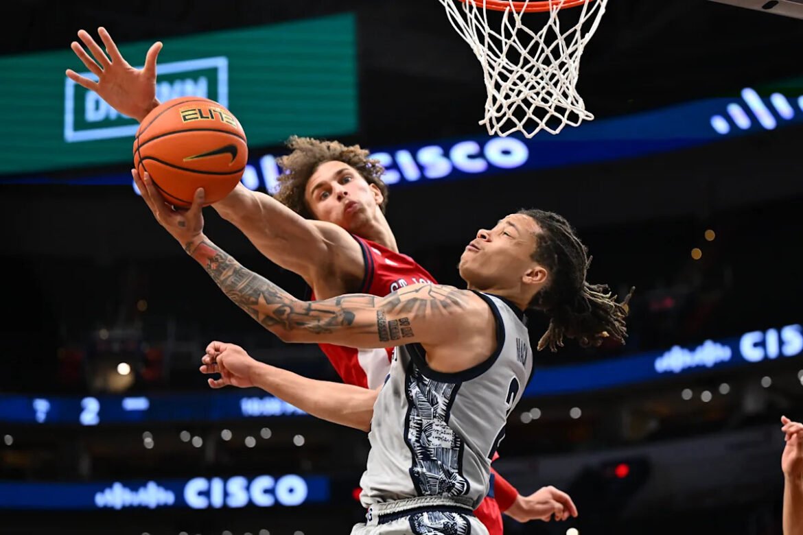 Ejiofor notched back to back baskets out of the commercial break to erase the Hoyas’ advantage. Love and Seal Diouf continued to battle for additional chances on the offensive glass, and the latter also managed to hang onto a pass from Lewis for a monster dunk. However, the backup big man also picked up his third foul, adding to the frontcourt staffing conundrum. At the 8:42 mark, Georgetown was hanging onto a 29-26 advantage.