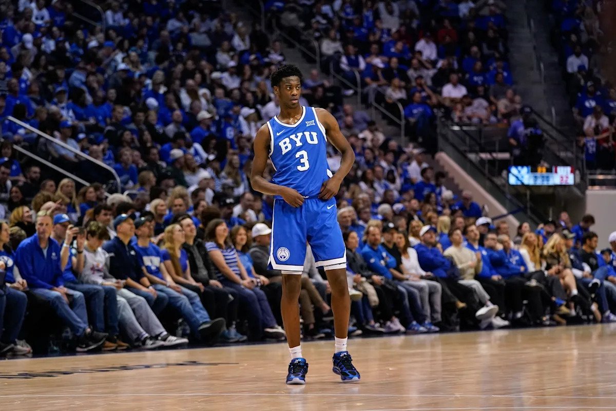 Jan 24, 2026; Provo, Utah, USA; BYU Cougars forward AJ Dybantsa (3) looks on during the first half against the Utah Utes at Marriott Center. Mandatory Credit: Aaron Baker-Imagn Images