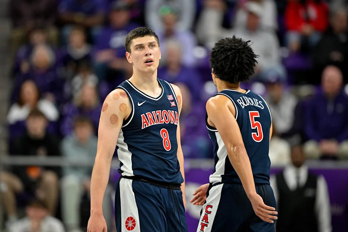Jan 10, 2026; Fort Worth, Texas, USA; Arizona Wildcats forward Ivan Kharchenkov (8) and guard Brayden Burries (5) celebrate during the game between the Horned Frogs and the Wildcats at Ed and Rae Schollmaier Arena. Mandatory Credit: Jerome Miron-Imagn Images