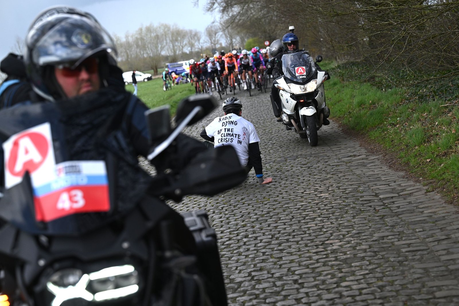 The political and environmental activist appeared on the course Around 30 kilometres from the finish line. Wearing a bike helmet and a T-shirt with the words “kids dying by the climate crisis in 3,2,1…” scrawled on the back, he broke free from the crowd and sat down on the ground as the densely packed peloton rapidly approached.