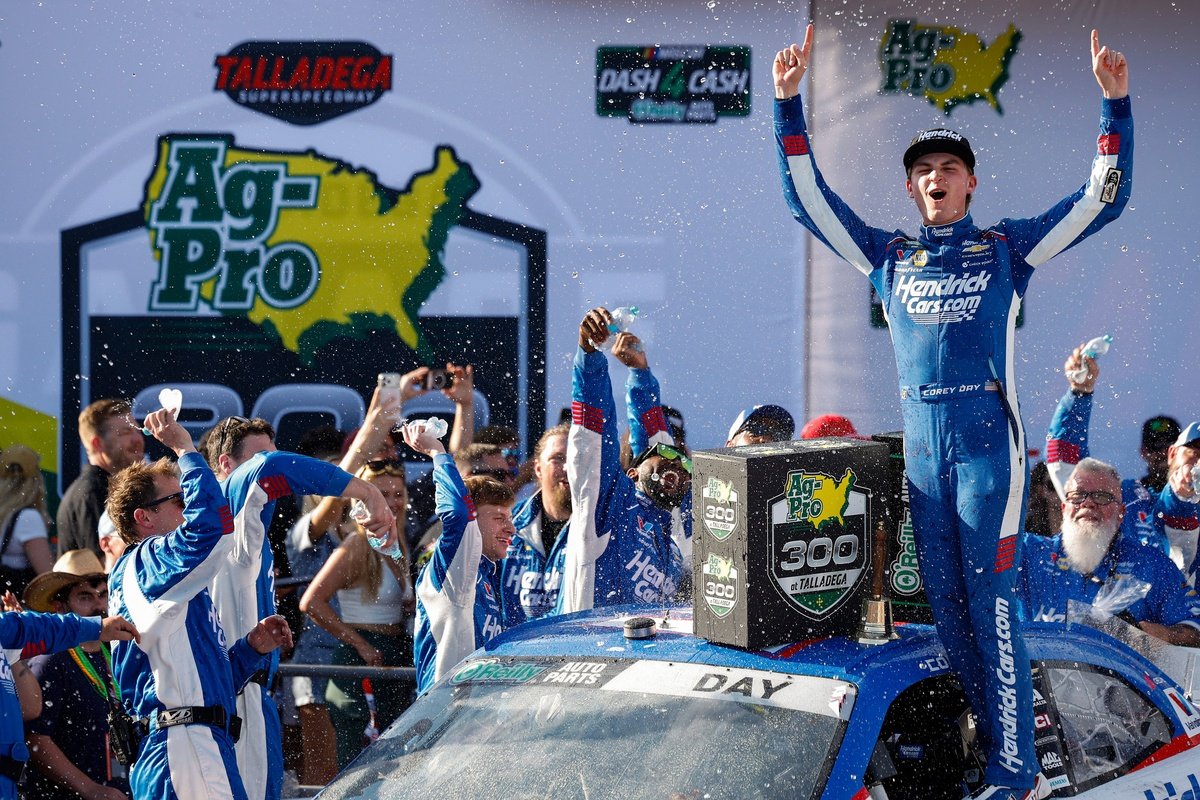 Saturday’s NASCAR O’Reilly Auto Parts Series race at Talladega Superspeedway ended in a dramatic crash, and it was a first career win for Hendrick Motorsports driver Corey Day, making his 22nd career start. The win also featured a new crew member on the No. 17, as Super Bowl champ Jason Kelce joined Hendrick Motorsports for this race, assisting the fueler.