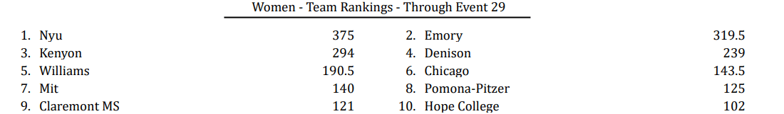 For the women, NYU had another big day as Nicole Ranile, Maeve O’Donnell and the 800 free relay team each secured titles. NYU has 375 points while Emory, which pulled off a stunner in the 200 medley relay Friday, is in second with 319.5 ahead of Kenyon (294), Denison (239) and Williams (190.5).