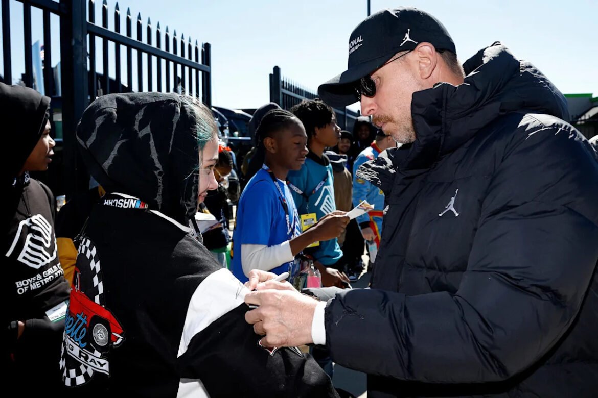 HAMPTON, GEORGIA – FEBRUARY 22: Joey Logano, driver of the #22 Shell Pennzoil Ford, waves to fans as he walks onstage during driver intros prior to the NASCAR Cup Series Autotrader 400 at Echo Park Speedway on February 22, 2026 in Hampton, Georgia. (Photo by Jonathan Bachman/Getty Images)