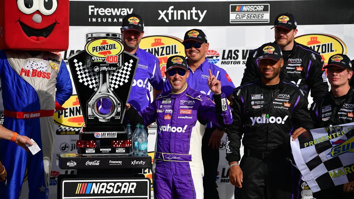 Home US SportsNASCAR Denny Hamlin storms back to win at Las Vegas after early penalty