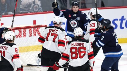 New Jersey defenseman Jonas Siegenthaler’s shot went in just under a minute later, but the Jets successfully challenged for goaltender interference because Paul Cotter had bumped into Hellebuyck.