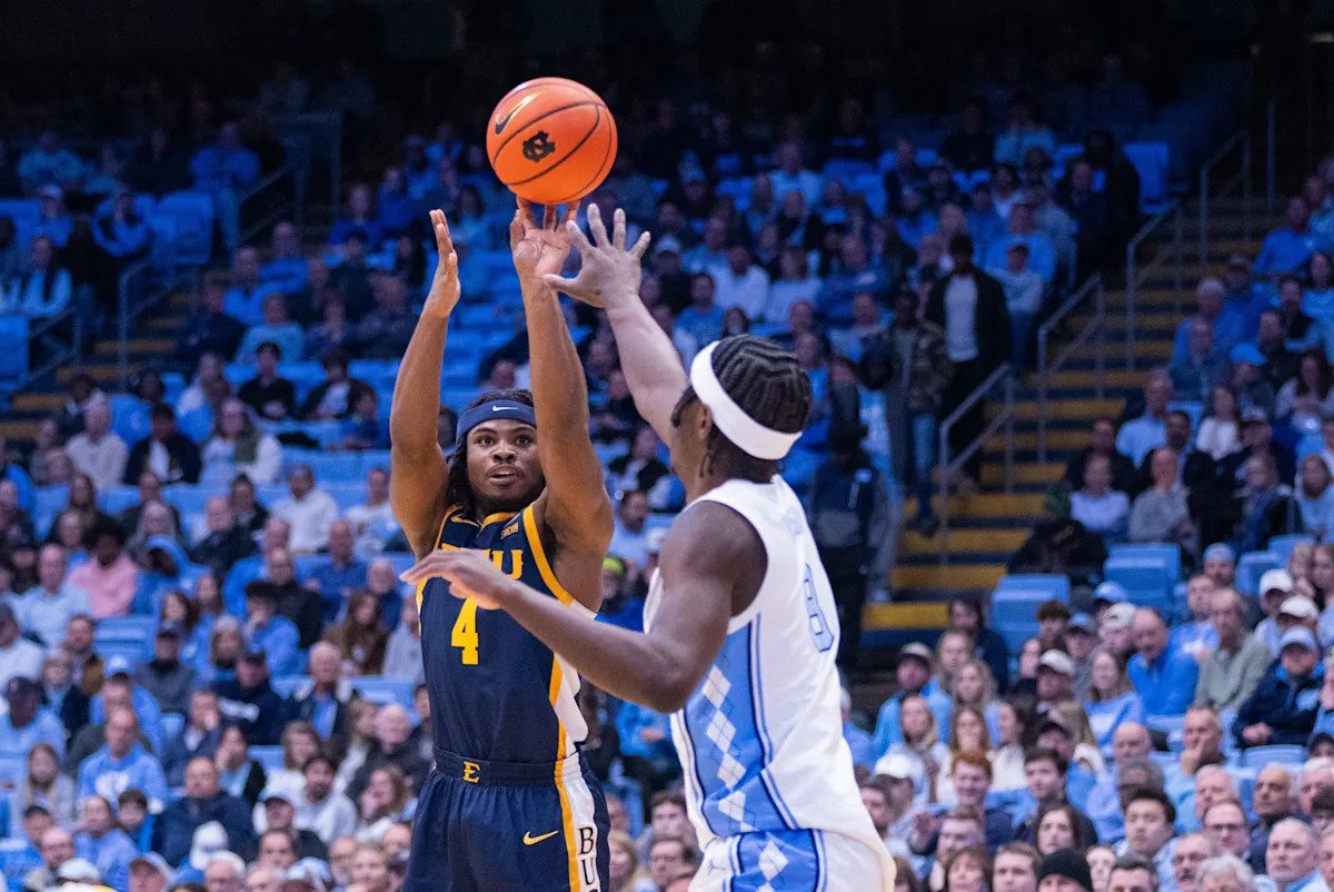 Dec 16, 2025; Chapel Hill, North Carolina, USA; ETSU Buccaneers guard Jaylen Smith (4) shoots over North Carolina Tar Heels forward Caleb Wilson (8) during the first half at Dean E. Smith Center. Mandatory Credit: Scott Kinser-Imagn Images