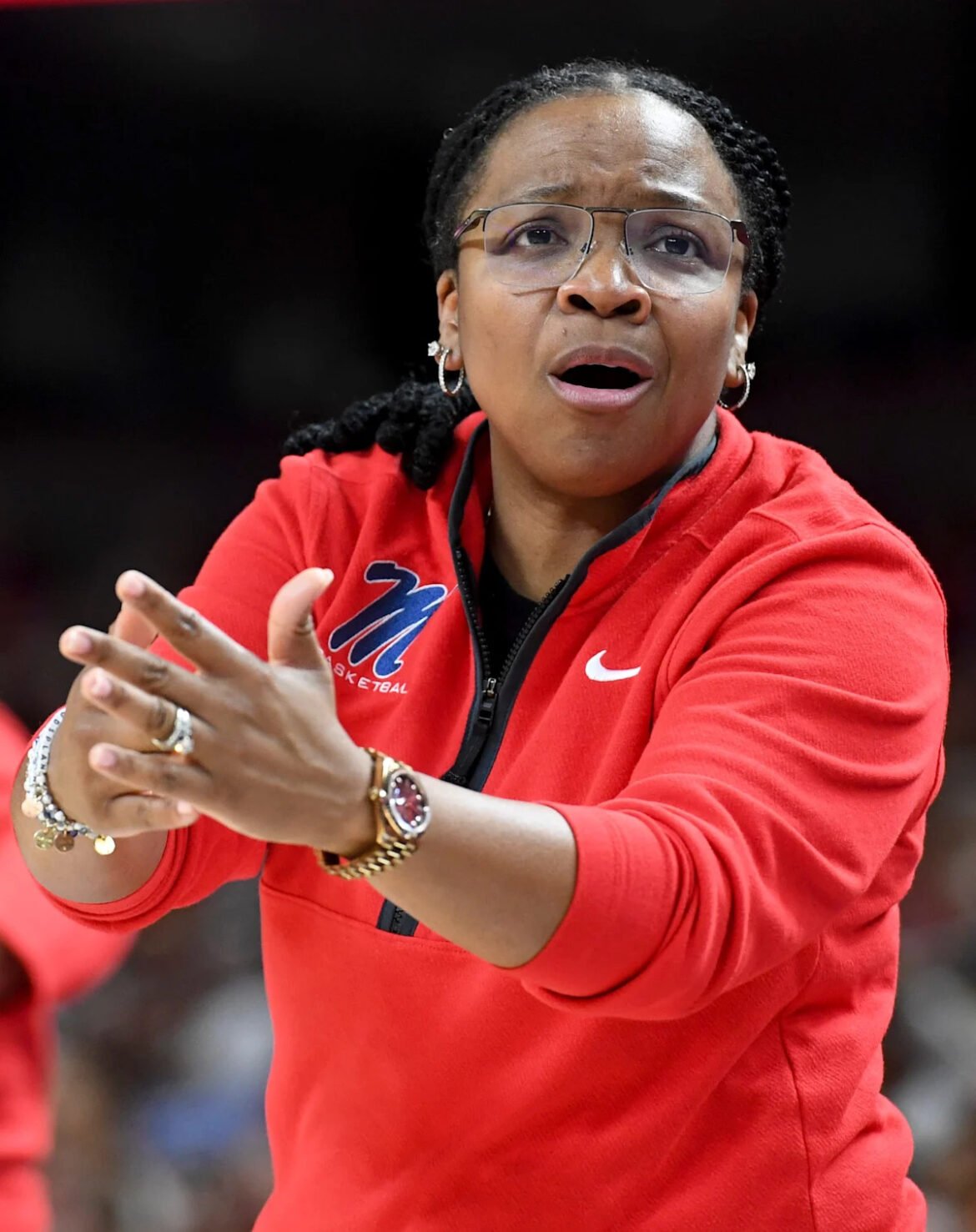 Ole Miss Rebels head coach Yolett McPhee-McCuin yells down court Thursday, March 5, 2026, during the SEC Women’s Basketball Tournament second round game against the Auburn Tigers at Bon Secours Wellness Arena in Greenville, South Carolina.