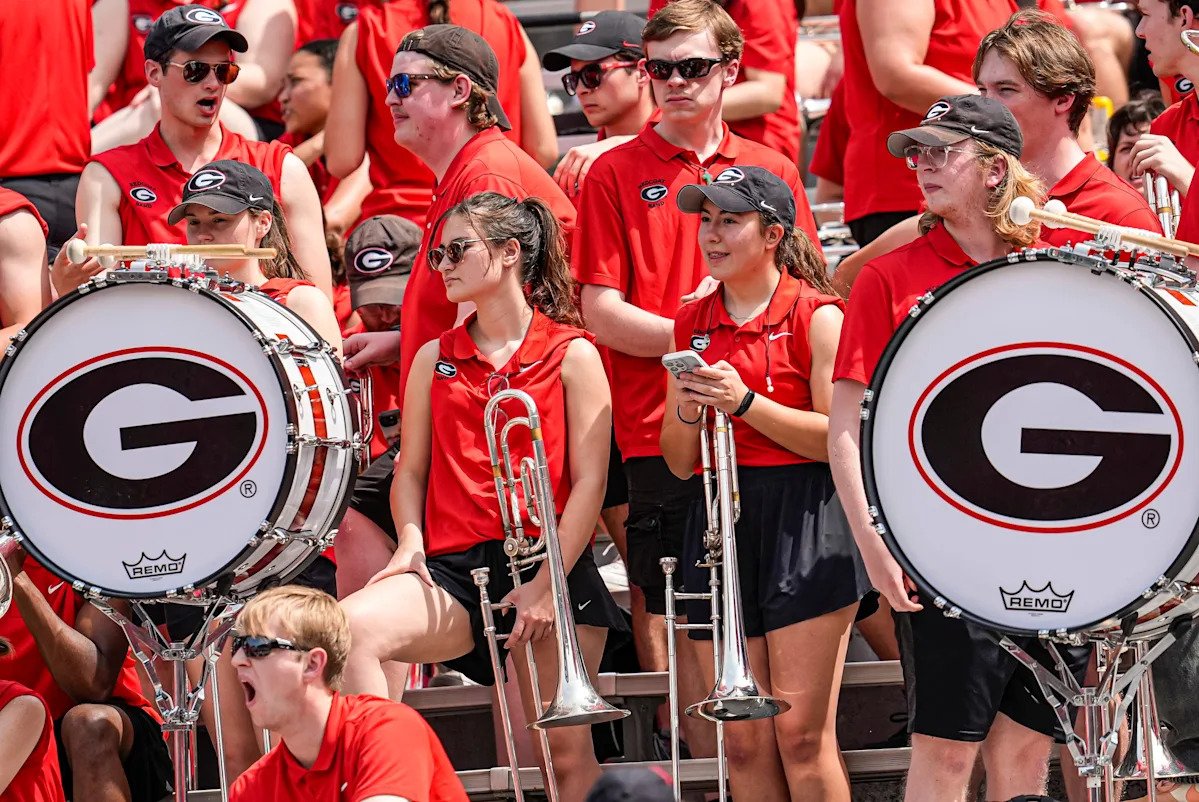Georgia Bulldogs band members shown in the stands prior to the Georgia Spring football game at Sanford Stadium