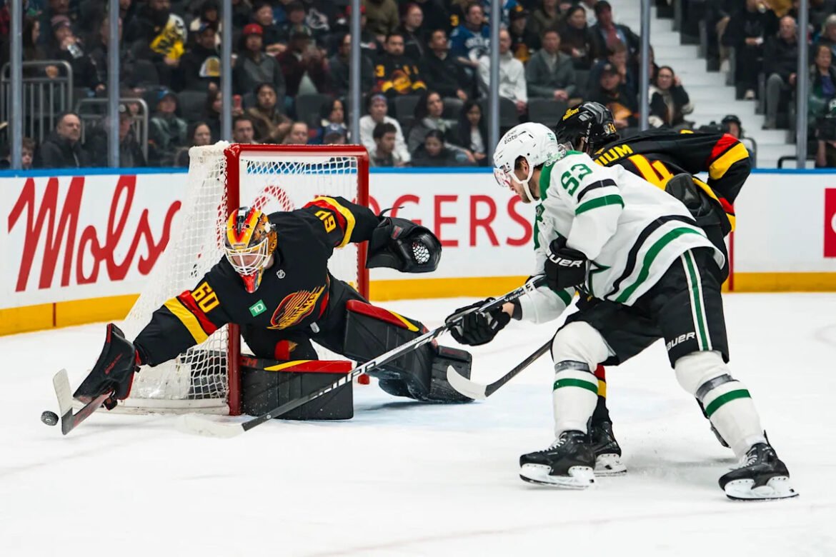 Mar 2, 2026; Vancouver, British Columbia, CAN; Vancouver Canucks defenseman Zeev Buium (24) and Dallas Stars forward Wyatt Johnston (53) watch as goalie Nikita Tolopilo (60) makes a save in the first period at Rogers Arena. Mandatory Credit: Bob Frid-Imagn Images