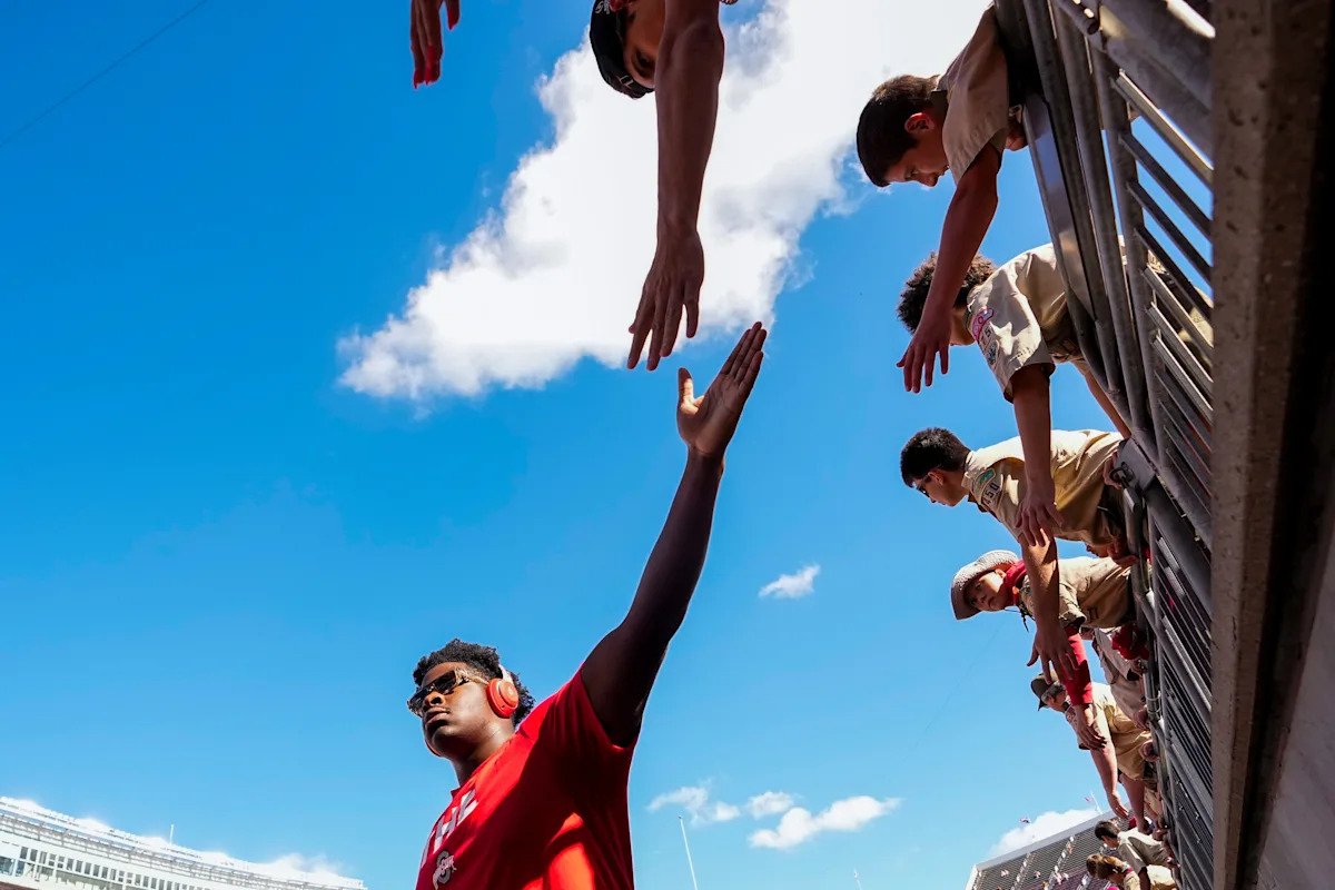 Ohio State offensive lineman Tegra Tshabola, here high-fiving fans before the Texas game on Aug. 30, has started all 13 OSU games this season.