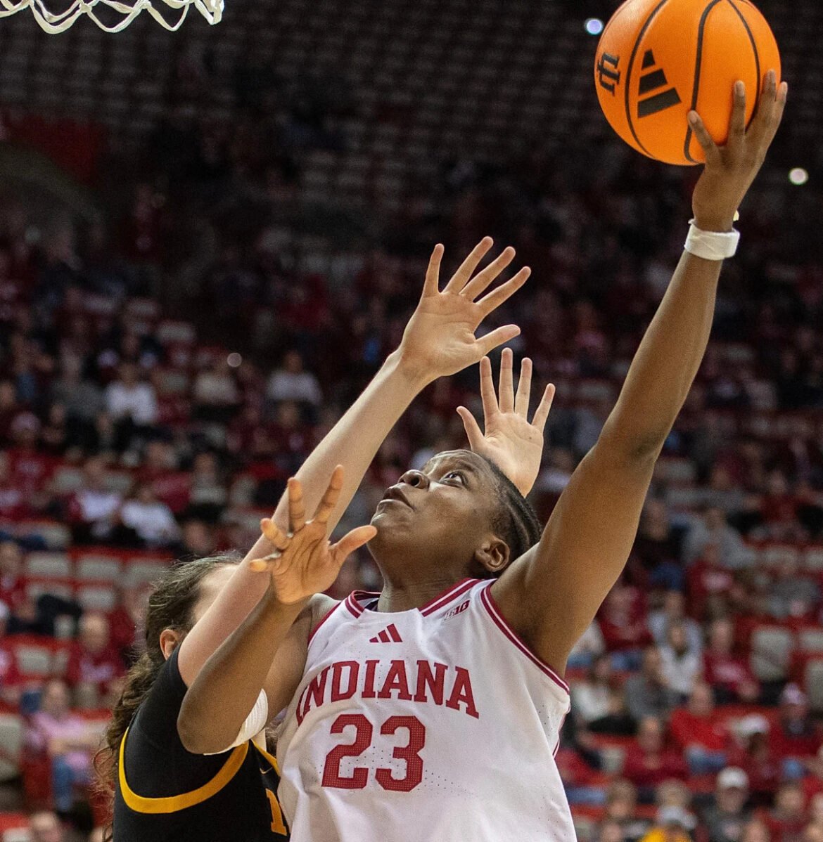 Indiana’s Zania Socka-Nguemen (23) shoots during the Indiana versus Iowa womens basketball game at Simon Skjodt Assembly Hall on Sunday, Jan. 11, 2026.