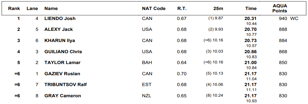 American Jack Alexy swam his fastest time of the circuit but still finished second here in 20.70. Kharun, previously the winner in Westmont, got his second top-three finish of the night in 20.73, with Carmel winner Chris Guiliano ending up fourth (20.86).