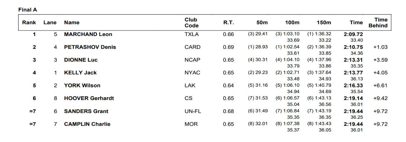 Reigning Olympic champion Leon Marchand sat in third place through the opening two lengths of the 200 breaststroke, but the European record holder had too much for the field over the back half of the race. Marchand managed a time of 2:09.72 to grab the win, with Denis Petrashov finishing second in 2:10.75. Marchand was .56 back of Petrashov at the halfway point, but was in the lead at the 150-meter turn and expanded his edge down the final length.