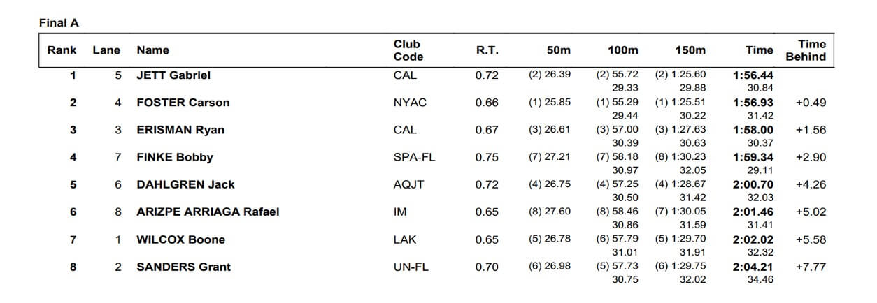 Cal’s Gabriel Jett never had the lead in the final of the 200 butterfly until the last length, where he was able to pull ahead of fellow American Carson Foster. Jett posted a time of 1:56.44, which was a half-second faster than the 1:56.93 produced by Foster. The difference was on the last lap, as Jett turned in a split of 30.84, compared to the 31.42 of Foster, who had a .09 edge through 150 meters.