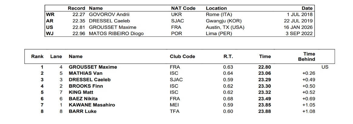 France’s Leon Marchand is set to contest the 200 breaststroke, an event in which he is the reigning Olympic titlist, and rising star Rylee Erisman will be the top seed in the 100 freestyle. Meanwhile, Regan Smith is scheduled to see duty in the finals of the 50 backstroke and 200 butterfly. Frenchman Maxime Grousset will chase victories in the 50 butterfly and 100 freestyle.