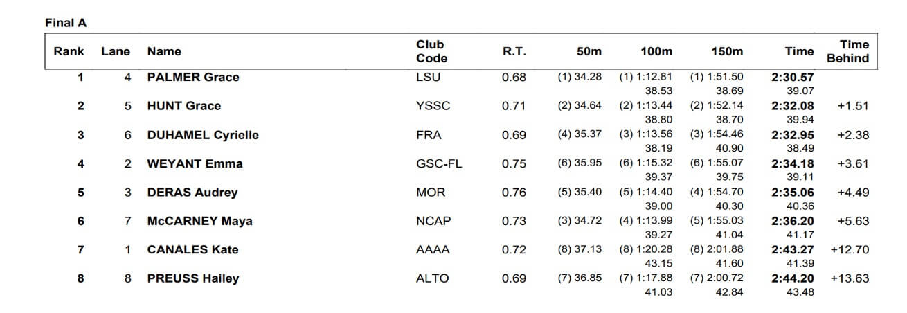 Grace Palmer was a wire-to-wire winner in the 200 breaststroke as the LSU athlete delivered a swim of 2:30.57, which handed her a margin of victory of 1.51 seconds. Grace Hunt was the runnerup in 2:32.08.