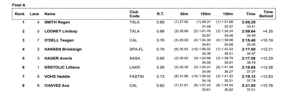 Racing the first of two events on the night, Regan Smith churned out a superb performance in the 200 butterfly. The reigning Olympic silver medalist in the meet, Smith logged a time of 2:05.29, which was good four a four-plus second advantage over runnerup Lindsay Looney (2:09.64). Smith was the champion of the 100 butterfly earlier in the meet, having goine 56-low in that event.