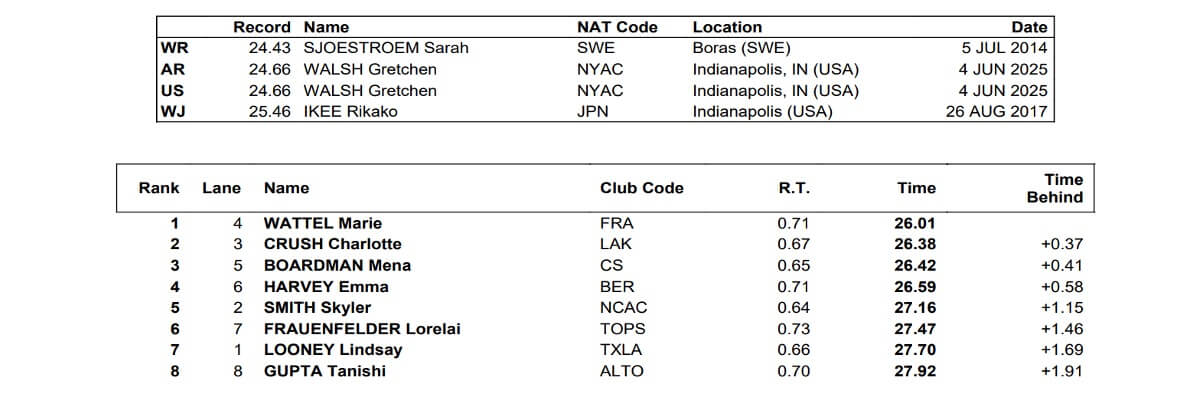 France’s Marie Wattel saved her best for the final round of the 50 butterfly. After easing through the prelims and semifinals on Friday, Wattel went 26.01 to grab the victory on Saturday night. Wattel’s time was comfortably clear of the 26.38 notched by American Charlotte Crush for second place.