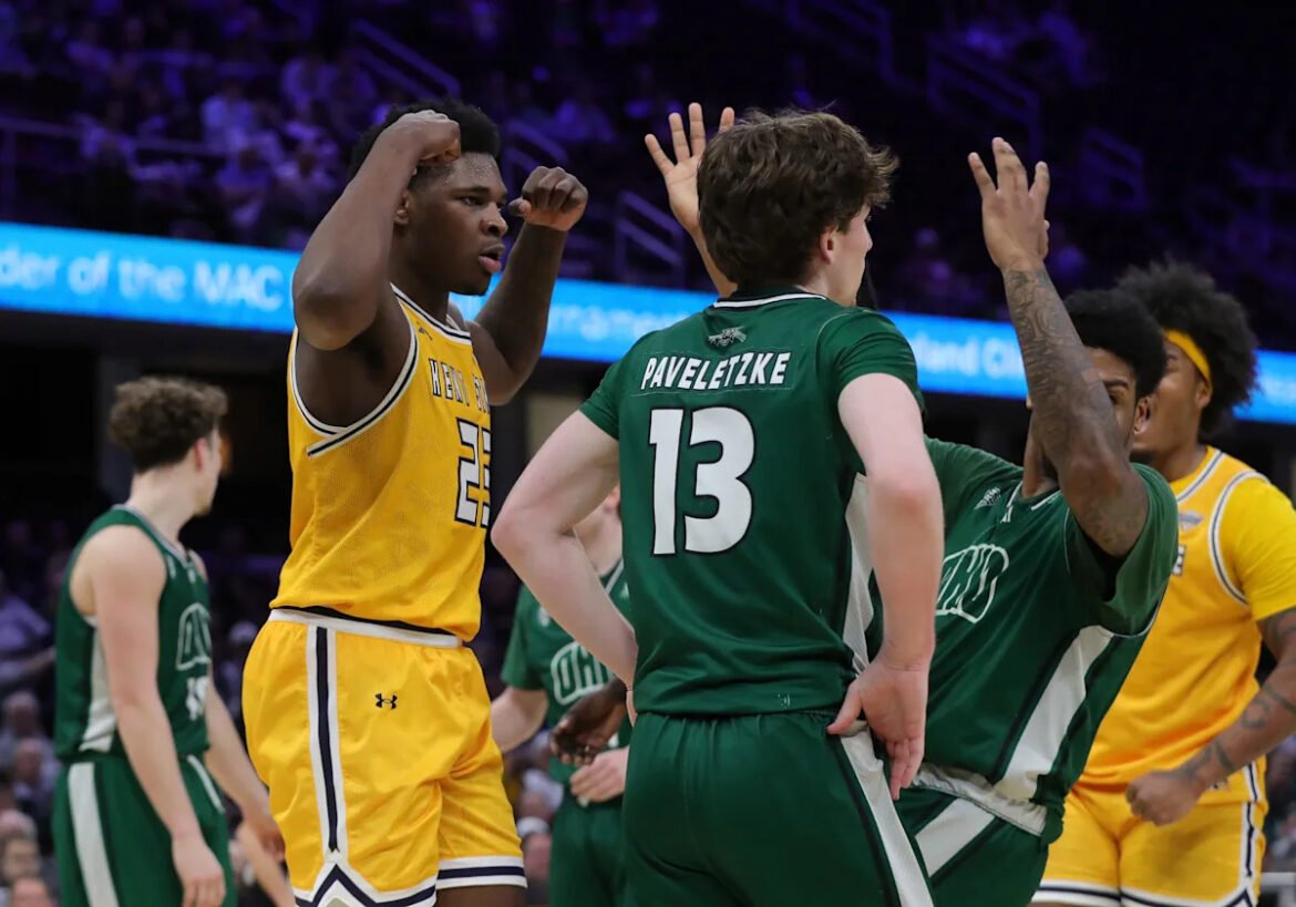 Kent State Golden Flashes forward Delrecco Gillespie (23) flexes after a shot against Ohio during the second half of an NCAA college basketball game in the quarterfinals of the MAC Basketball Tournament at Rocket Arena, March 12, 2026, in Cleveland, Ohio.