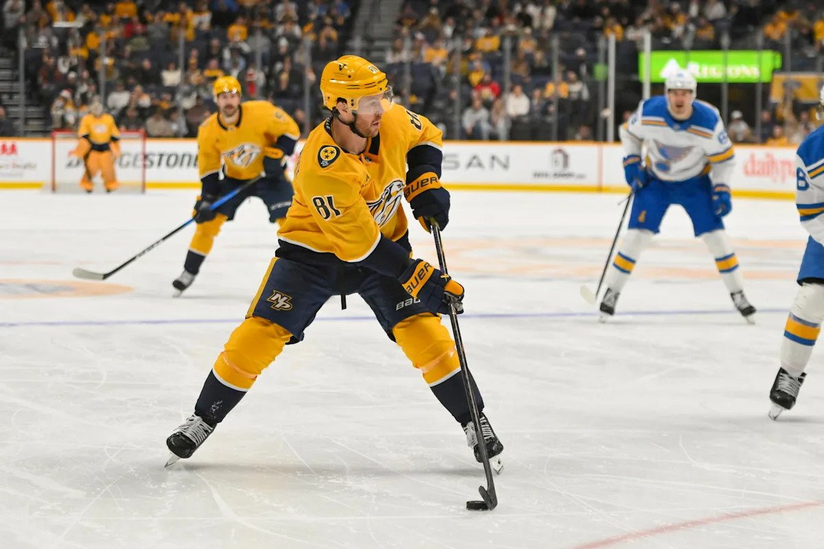 PHOTO CAPTION: Nashville Predators center Jonathan Marchessault (81) skates with the puck against the St. Louis Blues during the third period at Bridgestone Arena.