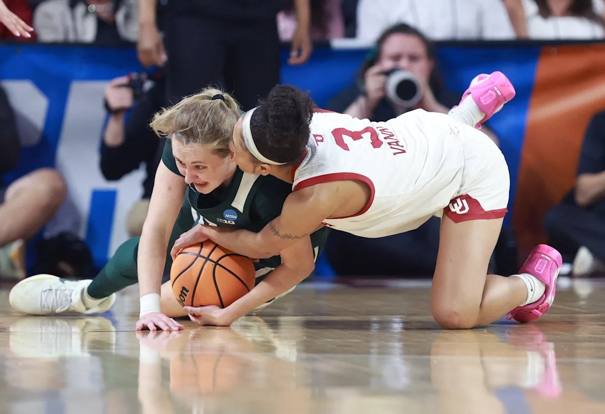 Michigan State’s Kennedy Blair (35) and Oklahoma’s Zya Vann (3) fight for a loose ball during a second-round game in the NCAA women’s basketball tournament between the Oklahoma Sooners and Michigan State Spartans at Lloyd Noble Center in Norman, Okla., Sunday March 22, 2026.