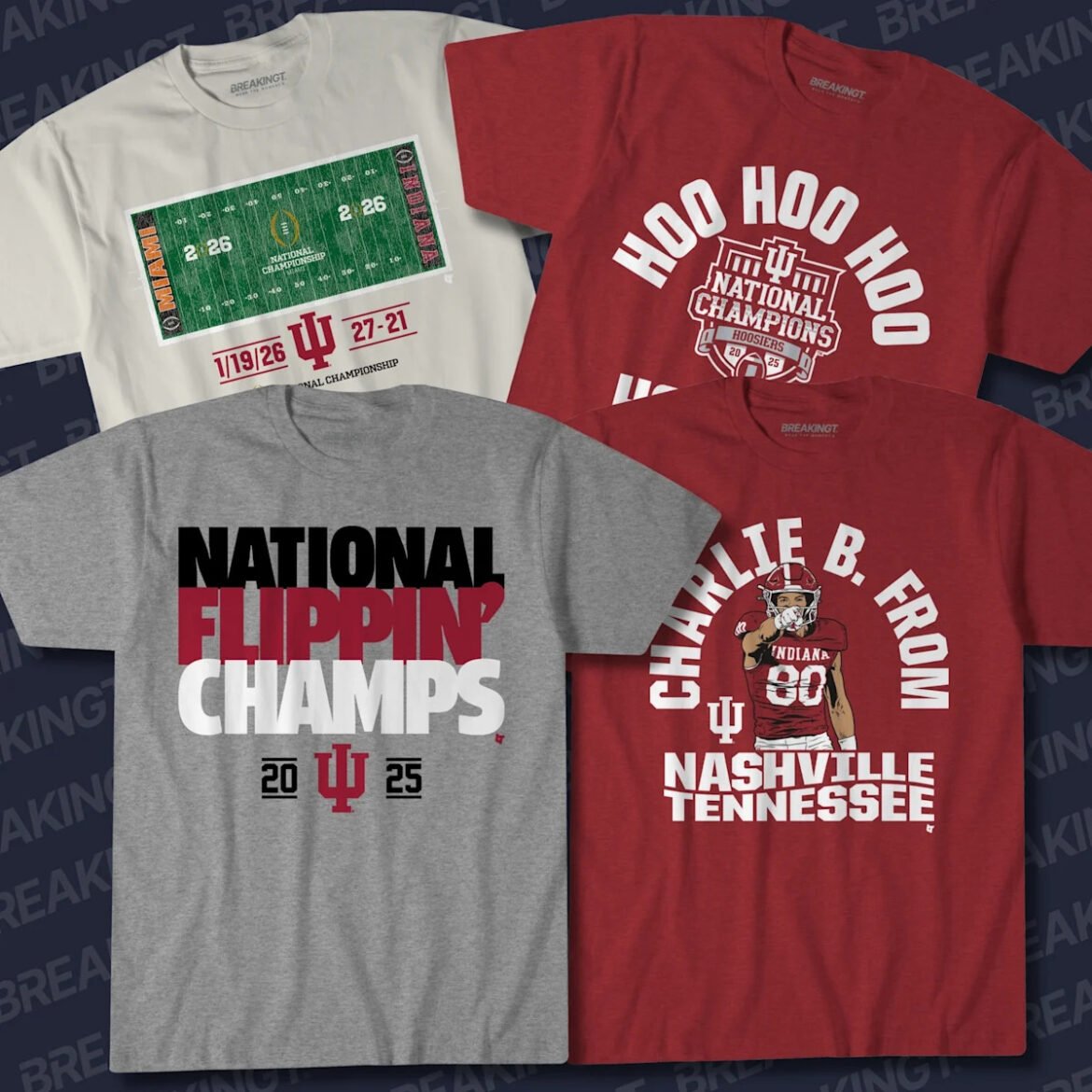 The folks over at BreakingT released an initial line of apparel just after the game, but have since. come out with even more merch commemorating Indiana’s win. From Fernando Mendoza’s postgame interview quotes to the championship field and a shirt featuring Charlie Becker, there’s a wide selection.