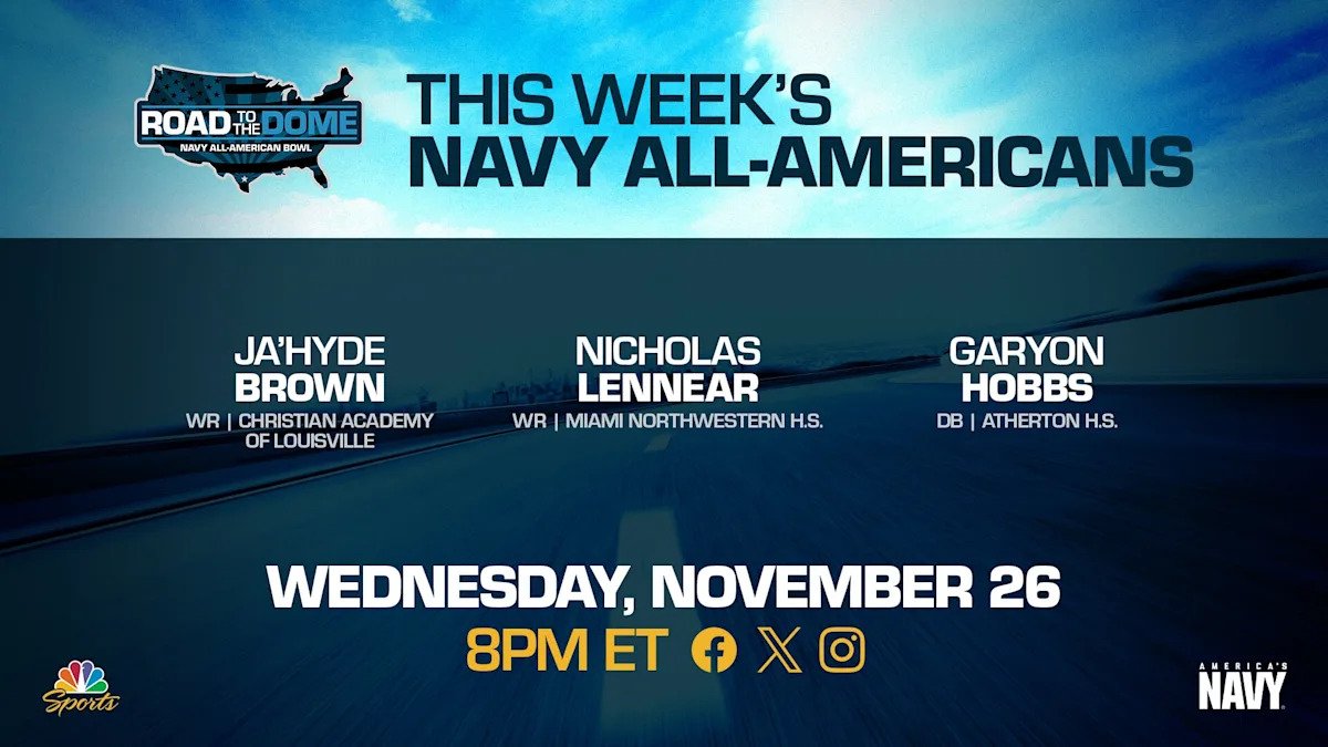 The 2026 Navy All-American Bowl will continue the Road to the Dome tour on Wednesday, November 26th at 8 p.m. ET on various social platforms across NBC Sports, honoring three Navy All-Americans.