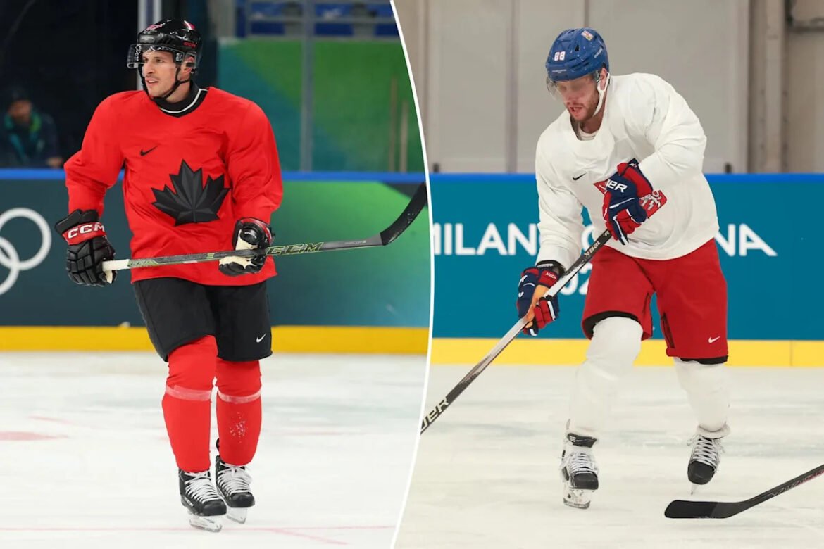 An image collage containing 2 images, Image 1 shows MILAN, ITALY – FEBRUARY 08: Sidney Crosby #87 of Team Canada takes part during training on day two of the Milano Cortina 2026 Winter Olympic games at Milano Santagiulia Ice Hockey Arena on February 08, 2026 in Milan, Italy. (Photo by Gregory Shamus/Getty Images), Image 2 shows MILAN, ITALY – FEBRUARY 09: David Pastrnak #88 of Team Czechia participates during training on day three of the Milano Cortina 2026 Winter Olympic games at Milano Santagiulia Ice Hockey Arena on February 09, 2026 in Milan, Italy. (Photo by Elsa/Getty Images)