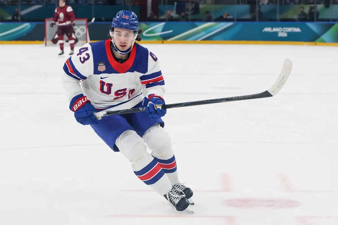 An image collage containing 1 images, Image 1 shows Quinn Hughes, who finally has a chance to play with his brother Jack, skates up ice during the United States’ win over Latvia in Milan