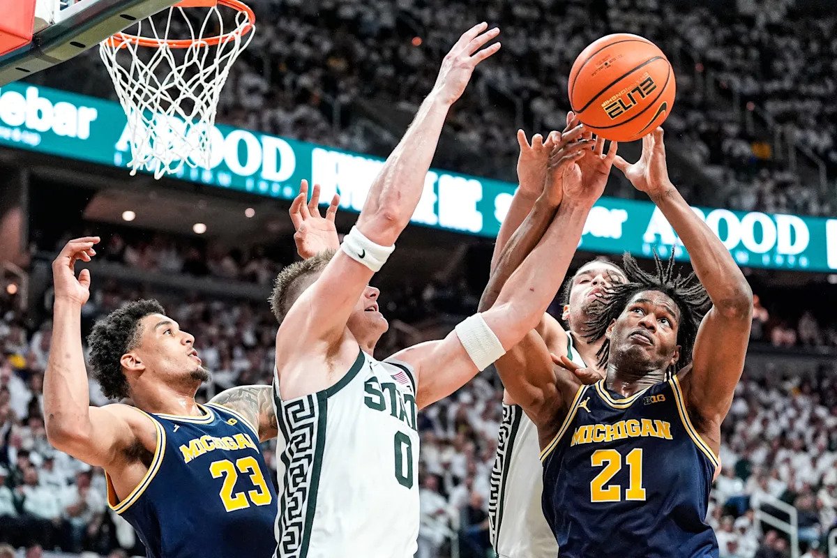 From left, Michigan forward Yaxel Lendeborg (23), Michigan State forward Jaxon Kohler (0), forward Jesse McCulloch (35) and Michigan forward Morez Johnson Jr. (21) battle for the rebound during the first half at Breslin Center in East Lansing on Friday, Jan. 30, 2026.