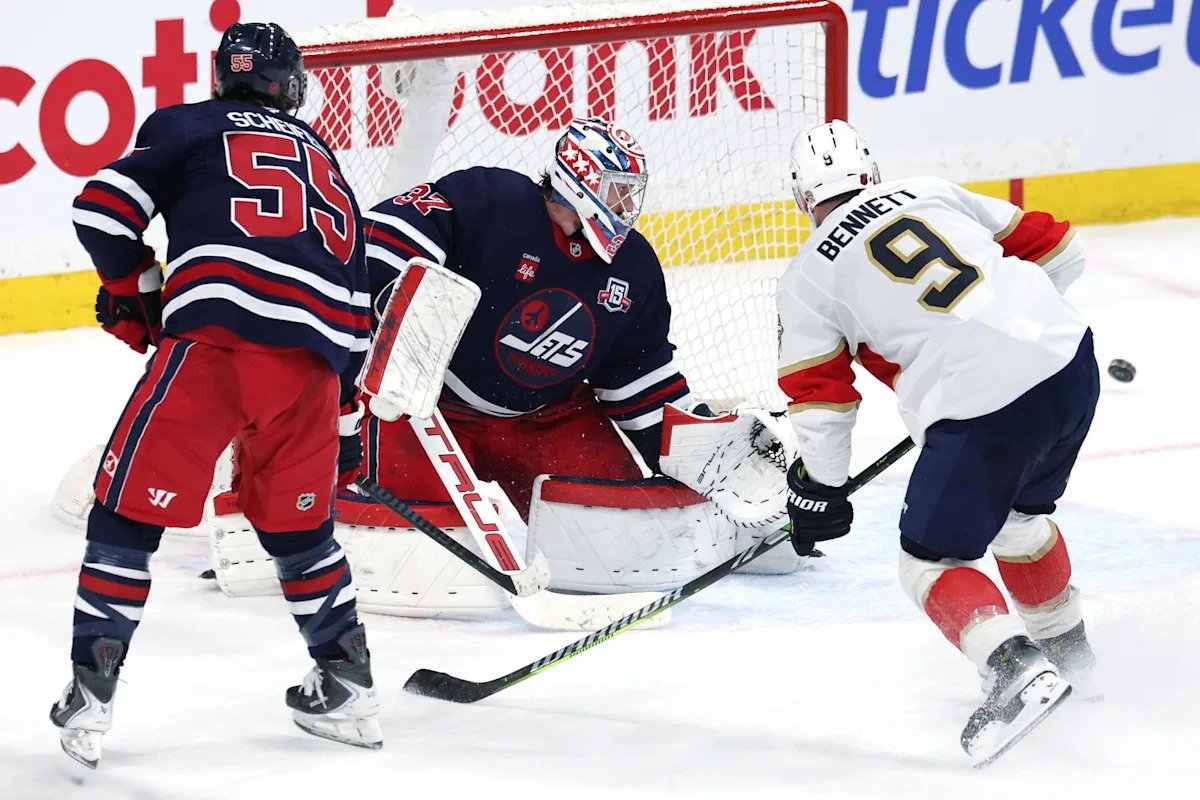 Photo caption: Jan 22, 2026; Winnipeg, Manitoba, CAN; Florida Panthers center Sam Bennett (9) shoots wide of Winnipeg Jets goaltender Connor Hellebuyck (37) in overtime at Canada Life Centre. (James Carey Lauder-Imagn Images)