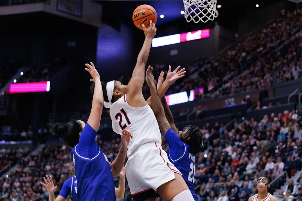 Sarah Strong had 18 points to lead four players in double digits as the UConn Huskies women’s basketball sunk the Seton Hall Pirates, 84-48, at PeoplesBank Arena in Hartford, CT on Saturday afternoon.