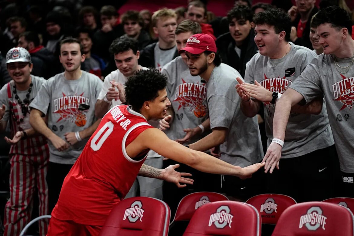 Ohio State guard John Mobley Jr. slaps hands with fans following a win over Penn State on Jan. 26.