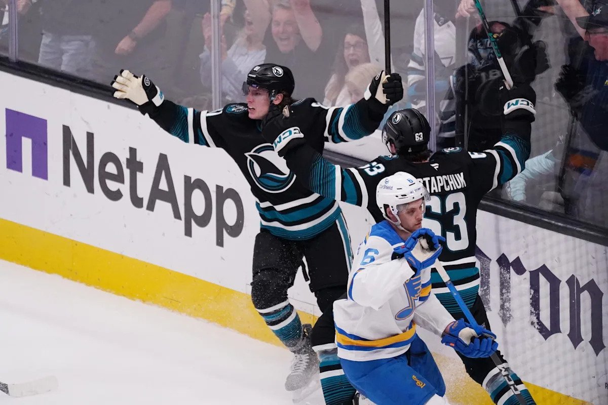 Shakir Mukhamadullin was called for hooking with less than a minute remaining in the middle frame, and the Blues didn’t take long to get back on the scoreboard. Philip Broberg scored the Blues’ third goal of the night, cutting the Sharks’ lead to a single goal.