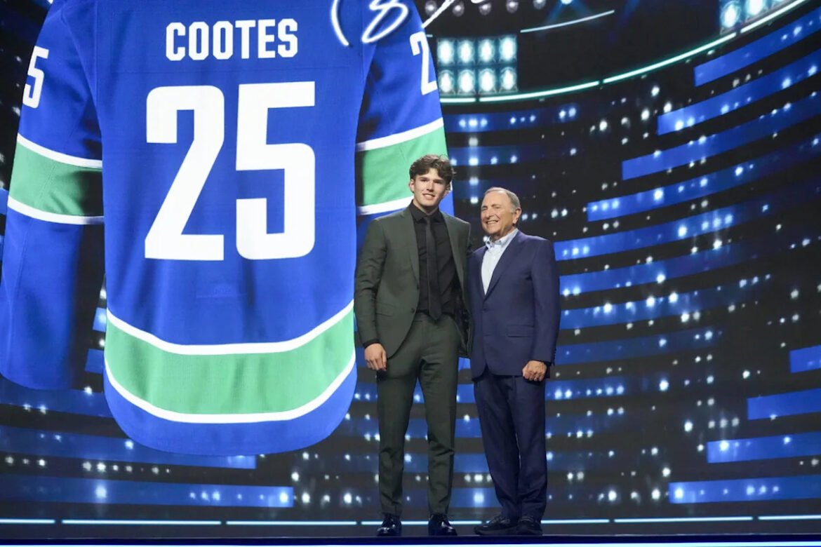 Jun 27, 2025; Los Angeles, California, USA; Braeden Cootes is selected as the 16th overall pick to the Vancouver Canucks in the first round of the 2025 NHL Draft at Peacock Theater. Mandatory Credit: Kirby Lee-Imagn Images