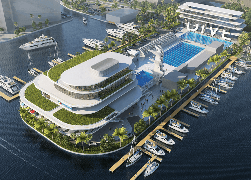 Alongside it sits the Fort Lauderdale Aquatic Center, with the Western Hemisphere’s highest dive tower at 27 meters and grandstands for 1,950spectators between the dive well and the competition pool. Together, the venues host World Aquatics Championships, Olympic Trials, and elite competition like the TYR Pro Swim Series. The promenade keeps athletes, coaches, and fans on site without leaving the waterfront while being entertained.