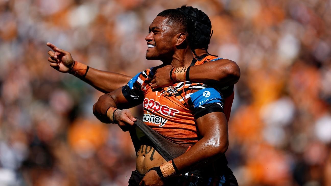 Jarome Luai had three try assists and Kai Pearce-Paul scored twice on club debut, with the Tigers racing to a 28-2 half-time lead and never looking back.