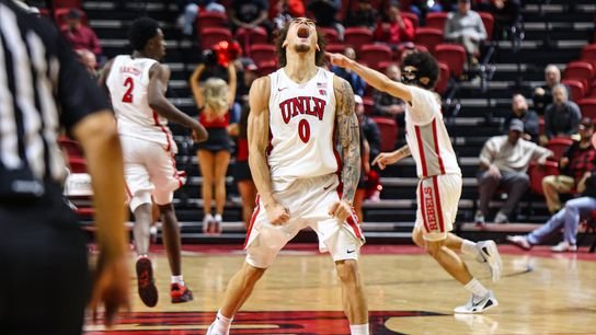 UNLV Runnin’ Rebels G Dravyn Gibbs-Lawhorn (0) celebrates after scoring a three-point shot against the Boise State Broncos on Tuesday January 13, 2026, in Las Vegas, Nevada.