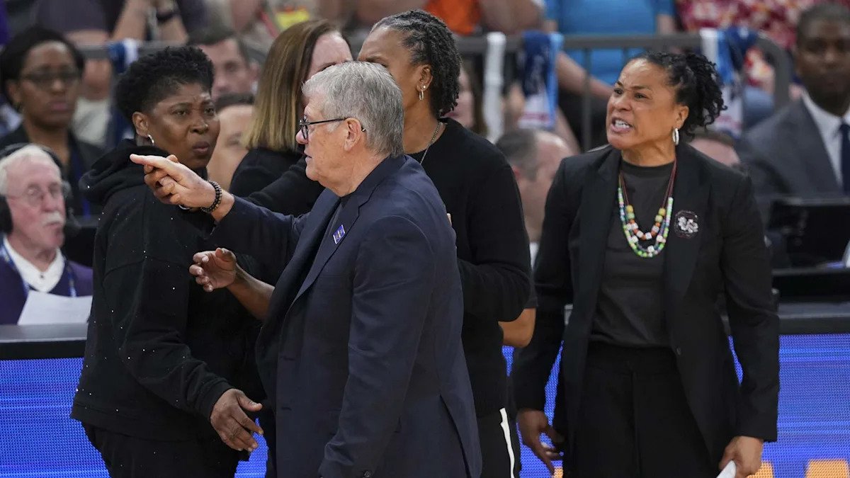 What exactly Auriemma said to Staley is unknown. It is known that he was incensed with the officiating, watching the Huskies pick up six third-quarter fouls to the Gamecocks’ zero. He said as much to ESPN’s Holly Rowe before the fourth quarter.